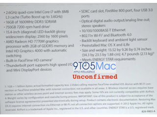 If you look under the display size, you notice that the resolution is only 1280 by 800. This resolution is not even close to what Apple would consider a retina display. However, an anonymous person sent in the alleged specs for the 15 inch MacBook Pro to 9to5Mac. Here's the picture (again, click for bigger size):